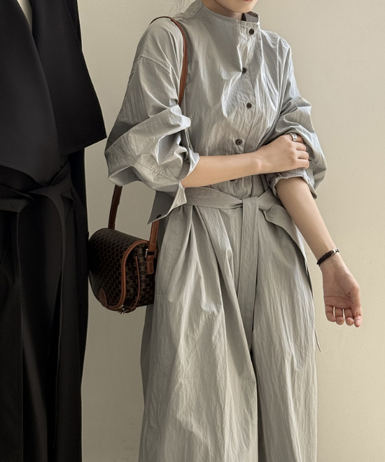 グレーブルーカラーのシャツワンピース。ハイネックとボタンのデザインが、個性的です。ブラウンのショルダーバッグをポイント使いで。