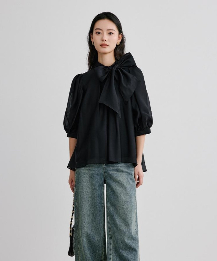 なかなか着こなしづらそうな大きめリボンデザインのブラウスこそ、ブラックカラーをチョイスするのがベター。フェミニンになりすぎないように、さらにボトムスにはカジュアルなデニム合わせがおすすめです。大人世代に着てほしい、甘辛ミックススタイルが完成します。