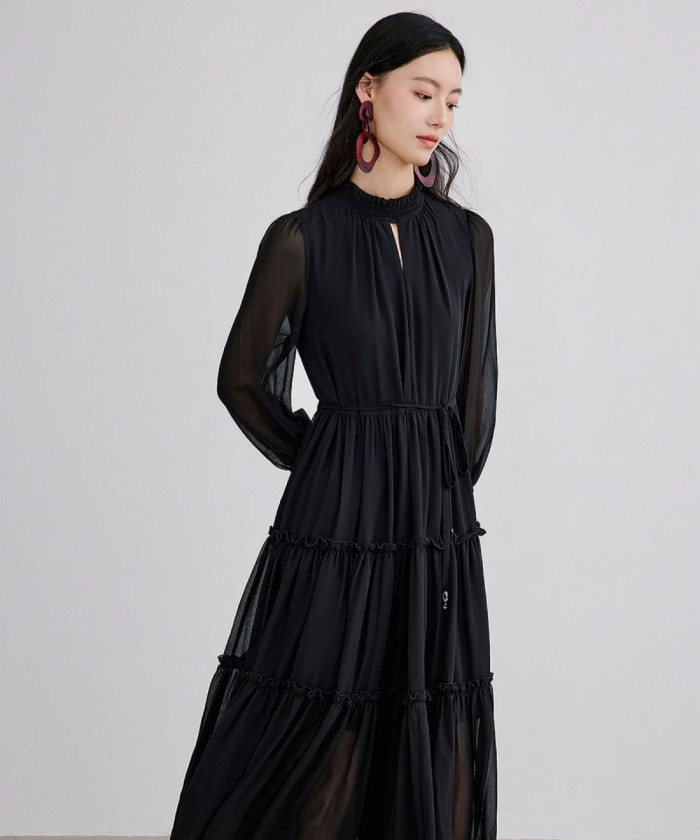フェミニンなイメージのワンピースを、ブラックカラーで引き締めた大人スタイル。オールブラックで全体的にクールな印象をプラスするので、ティアードデザインのワンピースでも簡単に着こなせます。シアー素材を扱っているので、オールブラックでも重たすぎない仕上がりに。上品なムードをまとえるので、オケージョンにもぴったり。