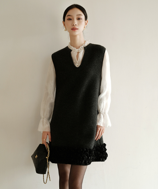 ミニ丈のベストデザインが可愛らしいシルエットに仕上げてくれるワンピース。しっかりとしたウールの生地とフリルのディテールのバランスがよく、大人可愛い雰囲気を演出してくれます。華やかな愛されワンピースは、ホリデーシーズンのデートにもぴったりです。