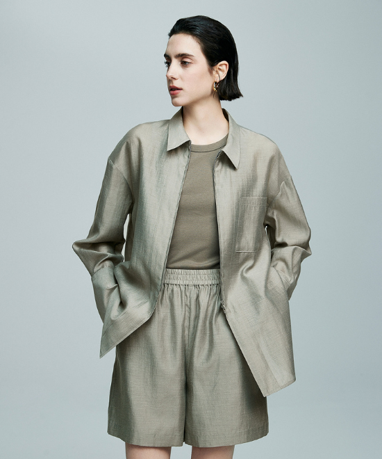 バージンコットンのさらりとした質感が心地よく、ダブルジッパーがシャープな印象を添えるシャツ。メンズライクな雰囲気を持ちながら、女性が着るとどこか抜け感のあるバランスに整います。羽織りとしても使いやすく、ベーシックなボトムに合わせるだけでこなれた表情に。
