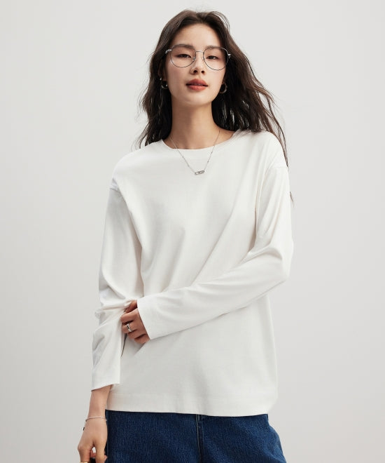 無駄をそぎ落としたようなミニマルデザインが魅力のラウンドネックカットソー。コットンの自然な風合いが心地よく、1枚でもインナーとしてでも使いやすい汎用性の高さがポイントです。ゆったりしすぎないシルエットで、メンズライクなコーデにほどよい女性らしさを添えてくれます。