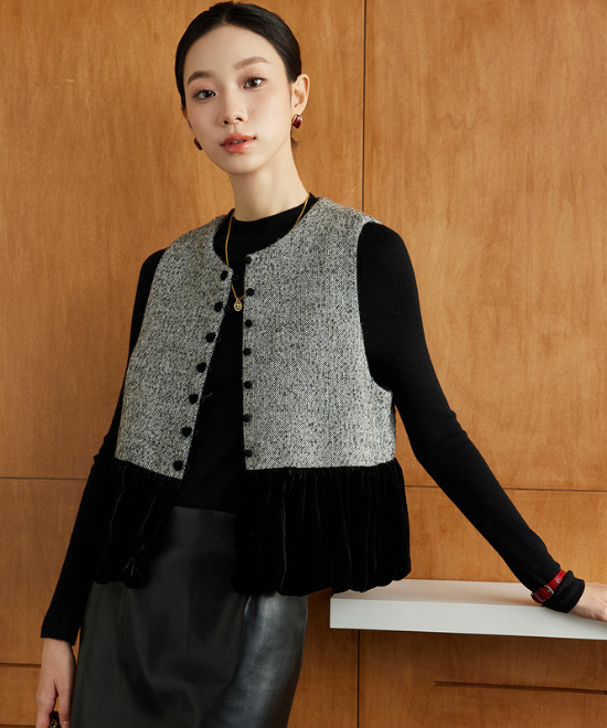 ベルベットプリーツのヘムラインが印象的なツイードベストは、冬コーデが陥りがちな“平べったく見える問題”を一瞬で解消してくれる頼もしい存在。ベースがどれだけシンプルでも、この一枚を重ねるだけでコーデに奥行きが生まれ、コーデの完成度がワンランク上に!