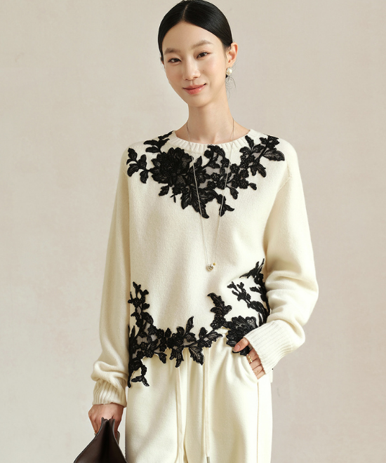 胸元と裾に施された大ぶりのレースが、“白ニットの定番感”を一気に脱却させる華やぎポイント。ウール100%の柔らかさと温かみがありつつ、甘さと上品さのバランスが絶妙で、冬のワードローブで特別感を放つ一枚。