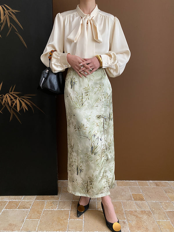 淡いベージュのドレープブラウスに、上品なボウタイがひらり。肌なじみの良い柔らかなトーンと、ほんのり艶のある素材感が、着るだけできれいめな余裕を演出してくれます。合わせるのは柄ロングスカート。動くたびに揺れる柄スカートが、無地トップスに華やぎをプラスして、バランスの良い大人フェミニンな着こなしに。