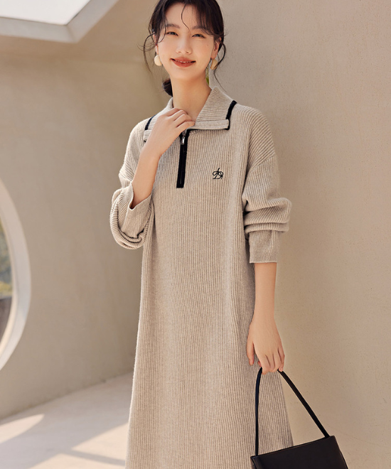 ジップアップデザインのニットワンピースは、ベージュとブラックの配色が大人カジュアルにぴったりの一枚。ジップを少し開けるだけで首元に抜け感が生まれ、顔まわりをすっきり見せてくれます。ゆったりめのシルエットながら、配色のコントラストが全体を引き締め、シンプルなのにおしゃれ見え。