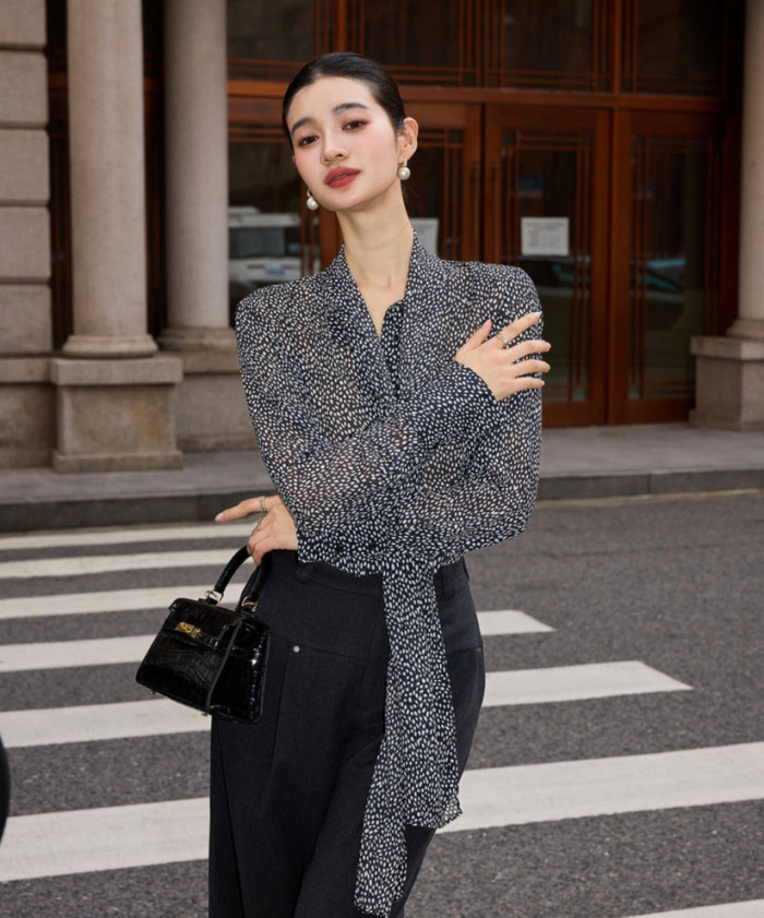 モノトーン調なのに、シアー素材で軽やかな素材のおかげでヘルシーで優しい印象で着用のできるリボンタイブラウス。【シアー×ドット×リボン×ブラウス】という4つのトレンド要素が詰まっているので、まさにトレンディーなアイテムと言えます。レイヤードスタイルにももってこいで着回し力抜群です。