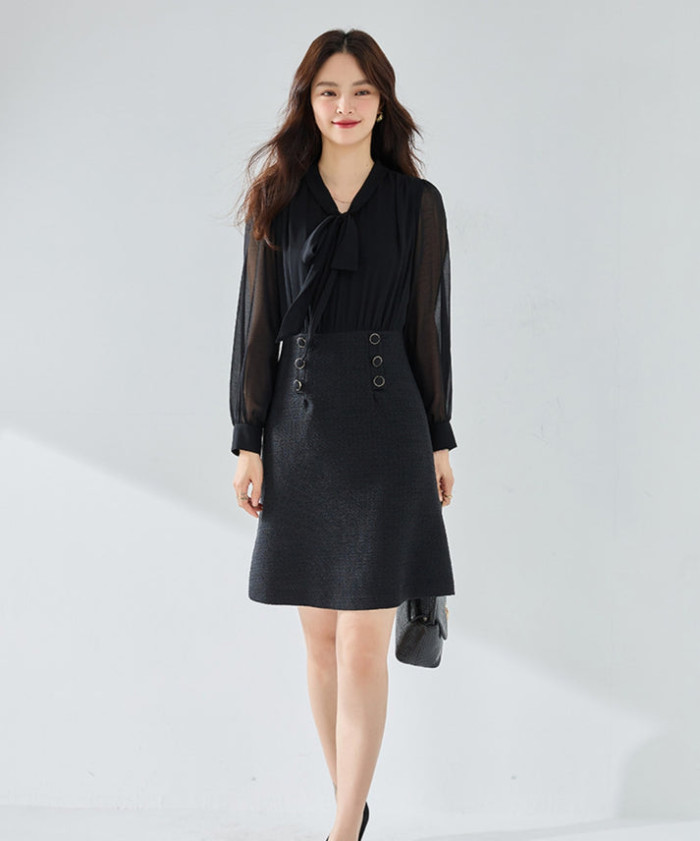 柔らかなシフォン素材のボウタイブラウスと、ツイードのタイトスカートを合わせたフェイクデザインワンピース。