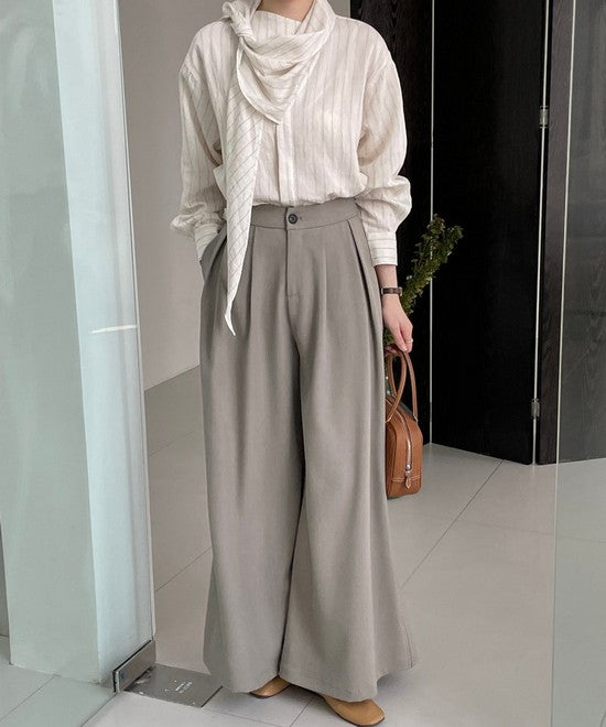 ハイウエストのドレープワイドパンツは、グレーの落ち着いた色味でレッグラインを拾わず、すっきりとしたシルエットを実現。柄シャツと合わせれば、きちんと感と遊び心を両立した大人スタイルに。程よいゆとりのあるワイドシルエットは体型カバーにも最適。