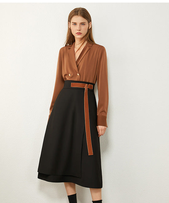ミモレ丈のAラインベルベットスカートは、ブラックならではの深い艶感が魅力。ブラウンのトップスを合わせれば、今年らしいトレンド配色でモードな表情に。異素材のコントラストが生む立体感で、シンプルなのにおしゃれ上級者な雰囲気が漂います。