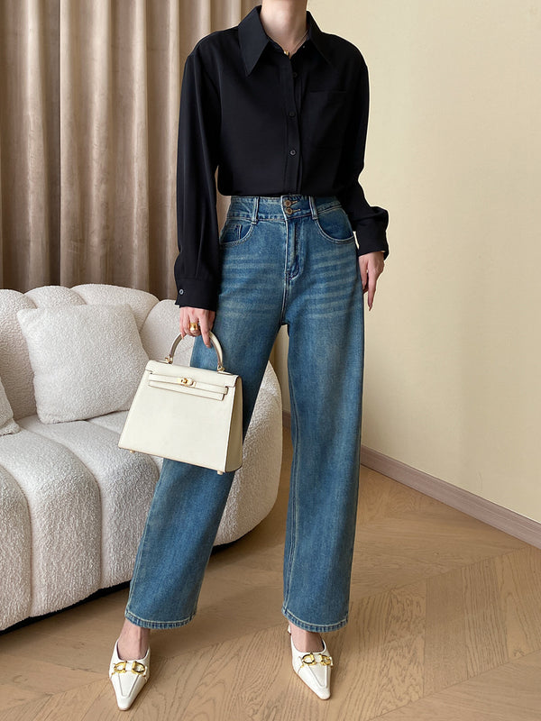 シンプルなドレープシャツは、ブラックならではのほどよいきちんと感が魅力。デニムパンツを合わせてカジュアルに落とし込めば、肩の力が抜けた大人バランスに仕上がります。足元とバッグをホワイトでまとめることで、抜け感が生まれ、全体が軽やかでクリーンな印象に。