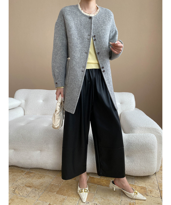 きれいめにも穿けるドロスト仕様のワイドレザーパンツ