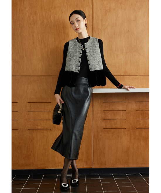 かつてはハンサムに着こなすことの多かったレザーアイテムも、今やきれいめファッションの格上げに。ツイードベストにかっちりめの小物を合わせた端正なコーデを洗練見えへと導きます。遊び心のあるベスト裾のプリーツはベルベット。素材でのメリハリも美しい。