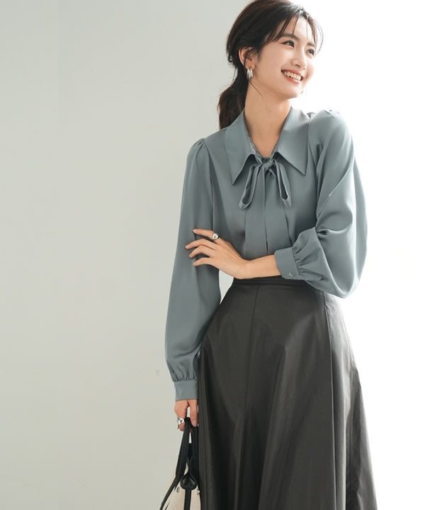 サテン素材にランタンスリーブがふんわりと映えるボウタイブラウスは、リボンの揺れ感が上品で女性らしい一枚。くすみブルーの落ち着いた色味が大人っぽさを引き立て、レザーのボトムスを合わせれば甘さをキリッと引き締めた洗練コーデに仕上がります。