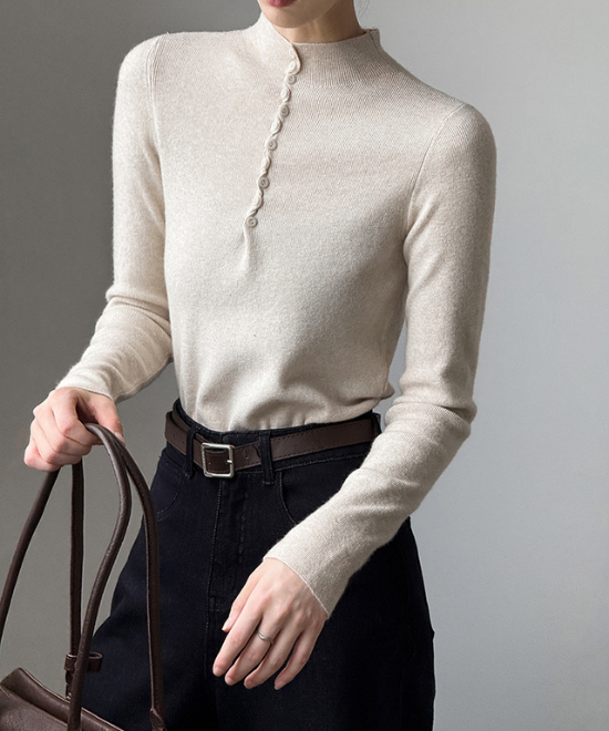 ウール混紡のあったか素材ながらも薄手でごわつかず、インナーに最適なニット。サイズ感もコンパクトで細身のジャケットも難なく羽織れます。首元を暖めつつ、もたつかないセミタートルも嬉しいですね。小さなボタンがアクセントになり、羽織を脱いでも洒落感たっぷりに。
