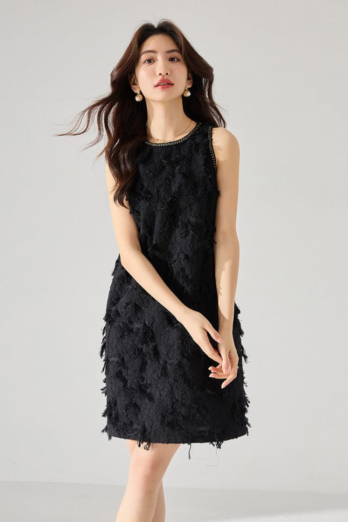 ジャガードの凹凸が光を含み、黒一色でも奥行きのある華やかさが生まれるノースリーブワンピース。Aラインのきれいな広がりが身体をすっきり見せ、パーティシーンにも上品に馴染みます。アクセサリーを添えるだけで存在感が際立つ、特別感のある一着です。
