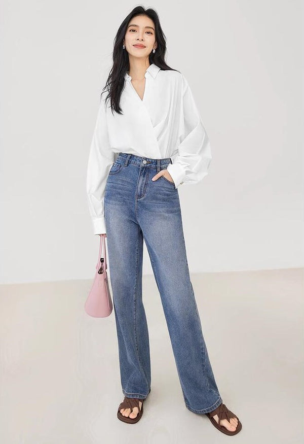 Vネックデザインが上品なホワイトシャツは、シンプルながらきちんと感を演出。デコルテを程よく見せるネックラインで顔まわりをすっきり見せつつ、デニムパンツを合わせればカジュアルダウンも叶う大人のバランスコーデが完成します。