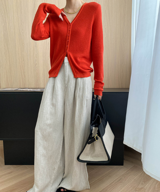 鮮やかなレッドのカーディガンは、コーデの主役になる存在感。ホワイトのワイドパンツを合わせることで、明暗のコントラストがはっきりと出て全体が引き締まり、色の組み合わせが美しく映えます。赤×白のシンプル配色は、鮮やかさと清潔感を両立できます。