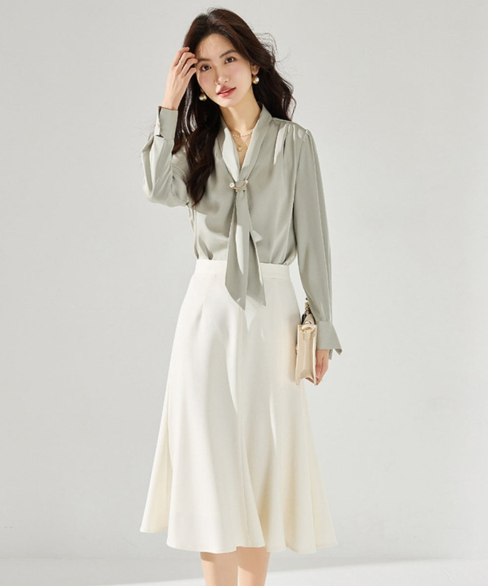 サテンの艶とリボンが映える上品ボウタイブラウス