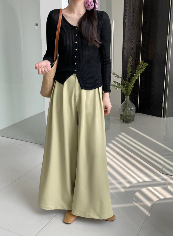 落ち感のあるドレープシルエットが特徴で、淡グリーンでもきれいめにまとまるワイドパンツ。よりフェミニンに着るなら、白やアイボリーの柔らかいトップスを合わせて“やさしい色合わせ”にすると◎。ハイウエストが脚を長く見せ、淡色でもスタイルアップが叶う一本です。