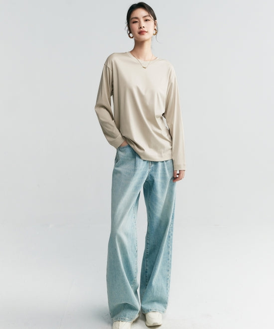 毎日でも着ていたいコットン100%素材のカットソー。個性的なボトムスも受け止められる基本アイテムのこちらに、あえてデニムパンツでシンプルにまとめるのも悪くない。その潔さがかえっておしゃれです。セーターを重ねて裾や袖口をちらりと覗かせるのもアリ。