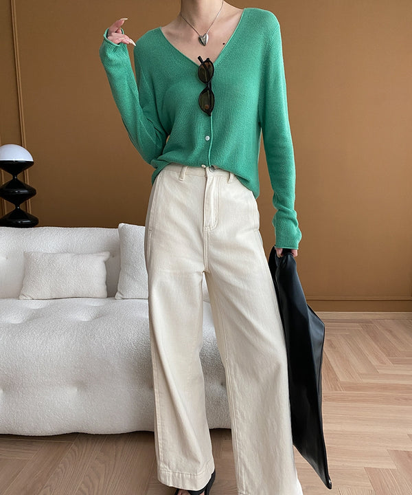 グリーンのVネックニットカーディガンは、顔まわりを明るく見せつつコーデの主役に。ホワイトのパンツを合わせることで色のコントラストが際立ち、全体が軽やかで爽やかな印象に仕上がります。グリーン×ホワイトの組み合わせは、大人カジュアルでも清潔感と華やかさを両立できるのがポイントです。