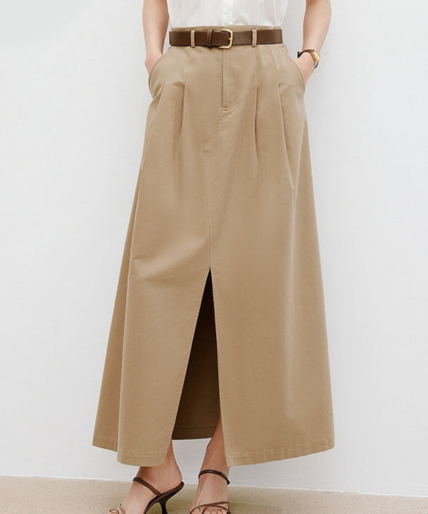 スリットが上品なベージュのロングスカートは、広がりすぎないきれいめシルエットで大人らしい印象に。タックデザインが立体感を生み、動きに合わせてさりげなく表情が変わるのも魅力。きちんと感がありつつ、デイリーからオフィスまで幅広く活躍する一枚です。