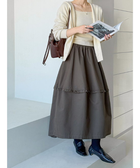 フリルがアクセントになったフレアが上品に揺れるロングスカートは、動きを妨げずふんわりとしたボリューム感が魅力。シンプルなデザインながら存在感があり、カジュアルからきれいめまで幅広く活躍する、大人の女性にぴったりの一枚です。