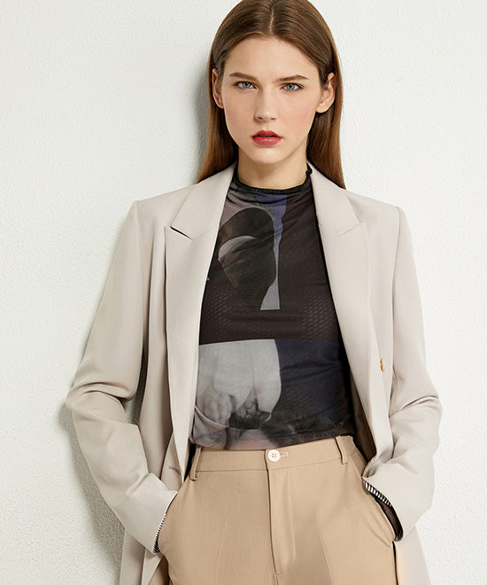 モードなグラフィック柄が目を引く一枚。ジャケットを重ねて柄の面積を控えめにすると取り入れやすく、ハイネックならニットやカーディガンのインにも活躍。季節を問わず使えるおしゃれなトップスです。
