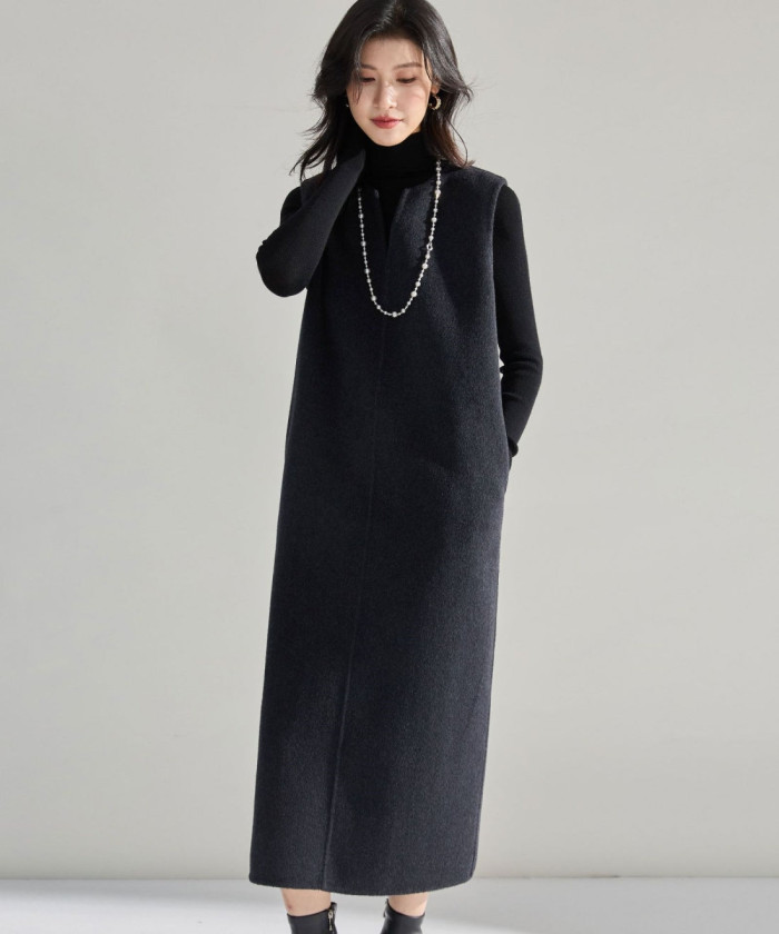 ウール素材のストレートシルエット、ノースリーブのロングワンピースは、レイヤードスタイルにもぴったりな一枚。ダークトーンでも大きめのネックレスをプラスすれば、全体が重たくならず顔まわりに華やかさを添えられます。