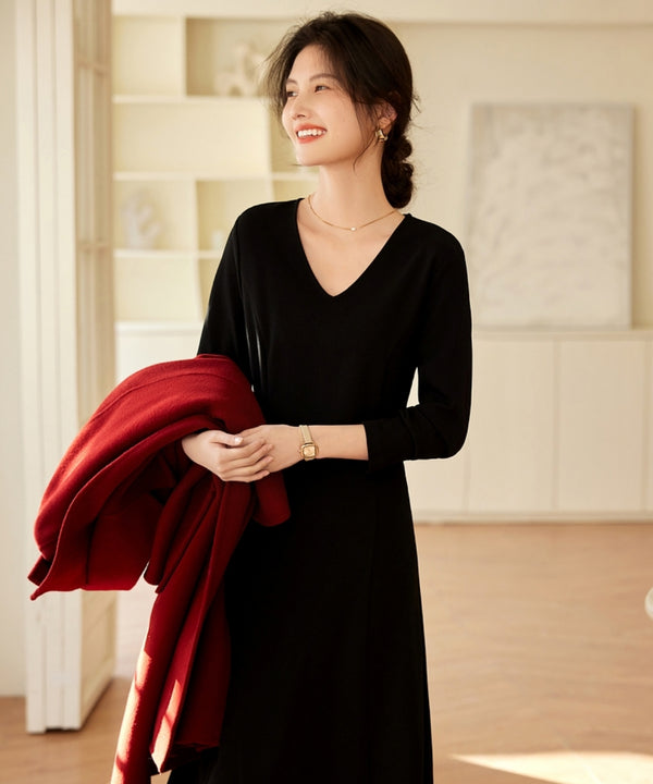 ドレープが美しいVネックのブラックワンピースは、シックで落ち着いた印象を与える一枚。鮮やかなレッドのアウターを合わせることで、全体の重さを軽減しつつ、コーデに華やかさとアクセントをプラスできます。