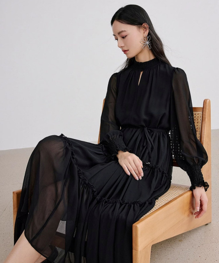 軽やかに広がるティアードに、ふんわりとした袖の透け感が重なり、デートにちょうどいい上品な華やぎが生まれる一枚。動きがあるたび表情が変わり、冬の重たさを感じさせない仕上がりに。甘さ控えめのデザインなので、大人のフェミニンを無理なく楽しめます。