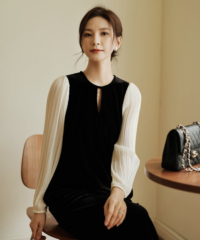 ベロアのなめらかさに、袖のプリーツがふんわりとした立体感を添えるデザイン。シンプルに見えて華やぎがしっかり出るので、デートシーンにも自信をくれる一枚です。身体をすっきり見せる切り替えバランスで、冬でも軽やかなスタイルが叶います。