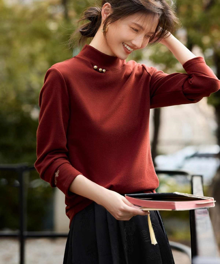 ボルドーハーフタートルネックニットを主役に、ブラックのボトムスで全体を引き締めたシックなスタイル。ニットの持つ上品な色合いと、ハーフタートルのエレガントなディテールを活かすため、ボトムスにはブラックのレザー調プリーツスカートを合わせるのがおすすめです。異なる素材感をミックスすることで、奥行きと洗練された印象が生まれます。足元は黒のショートブーツ、バッグはゴールドのチェーンがあしらわれたミニバッグで華やぎをプラス。ボルドーの持つドラマティックなムードを最大限に引き出した大人の着こなしです。