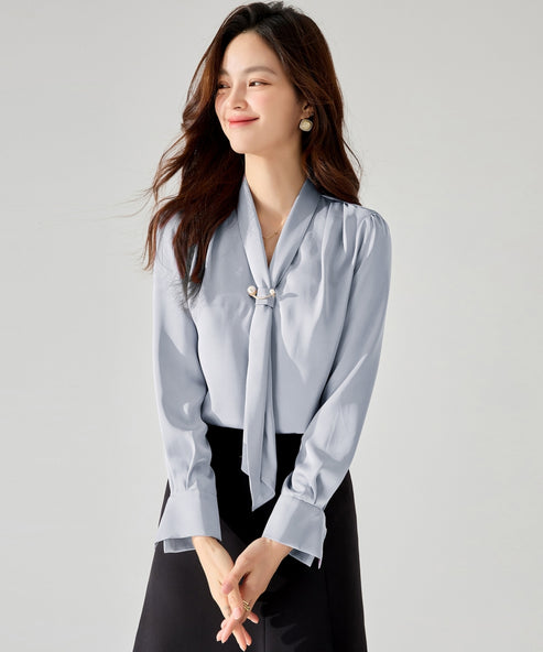 ベビーブルーブラウスで顔周り美人!パール使いが光るレディスタイル