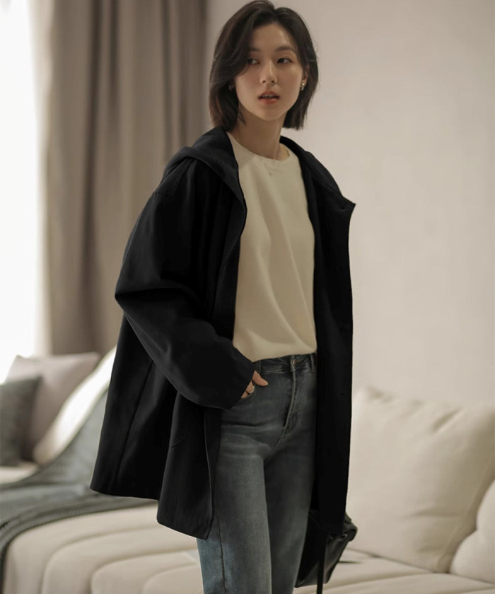ゆるやかなフォルムが今っぽいウインドブレーカーは、細身ボトムと合わせることで一気に大人らしくバランス良く見えるアウター。黒のクールさと動きのある素材感が重なり、ワンカラーでも立体感が生まれます。足元はボリュームスニーカーよりもすっきりフォルムを選ぶと、よりスタイルよくまとまります。