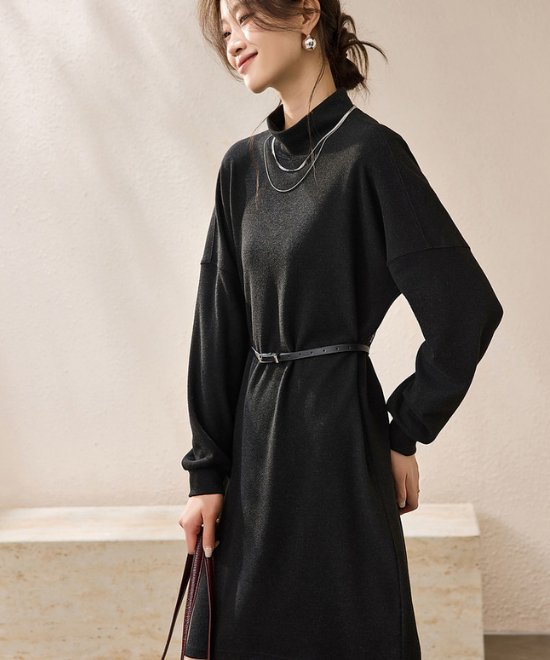 首元が適度に立ち上がるセミタートルは、視線が上に向くことで自然とスタイルアップが期待できるデザイン。滑らかに落ちるシルエットが脚のラインをまっすぐ見せ、ショートブーツと合わせるとより細さが際立ちます。ワンピの丈とブーツの高さに少し隙間を作ることで、より軽やかなバランスに。