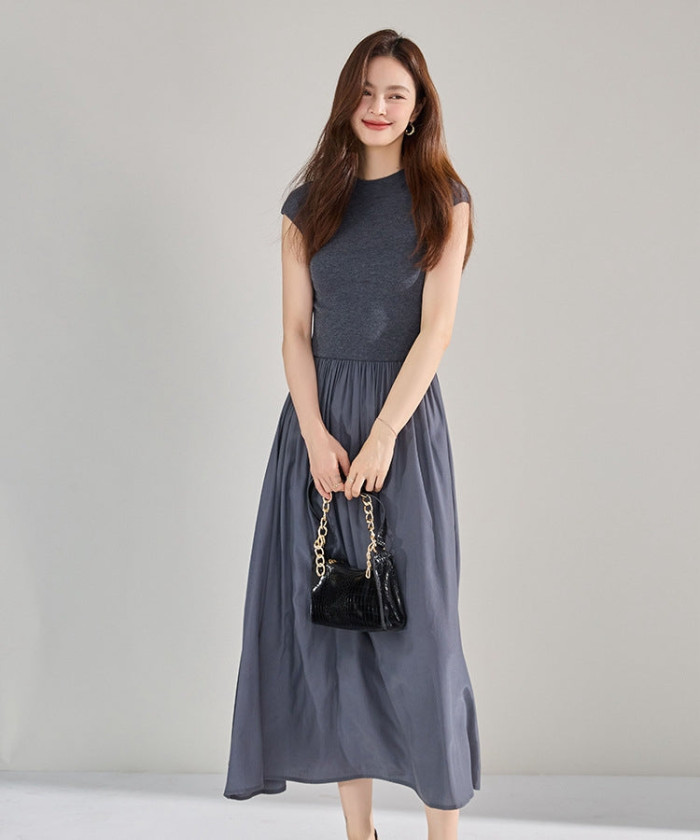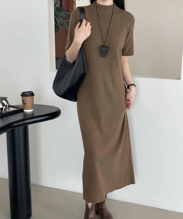 肩まわりが軽く見えるハーフスリーブは、ロング丈でも抜け感が生まれやすいデザイン。ショートブーツと合わせると足元にリズムが生まれ、ワンピの縦長シルエットがより引き立ちます。少し太めの筒のブーツを選ぶと足首との差が強調され、自然な美脚効果が期待できるバランスに。