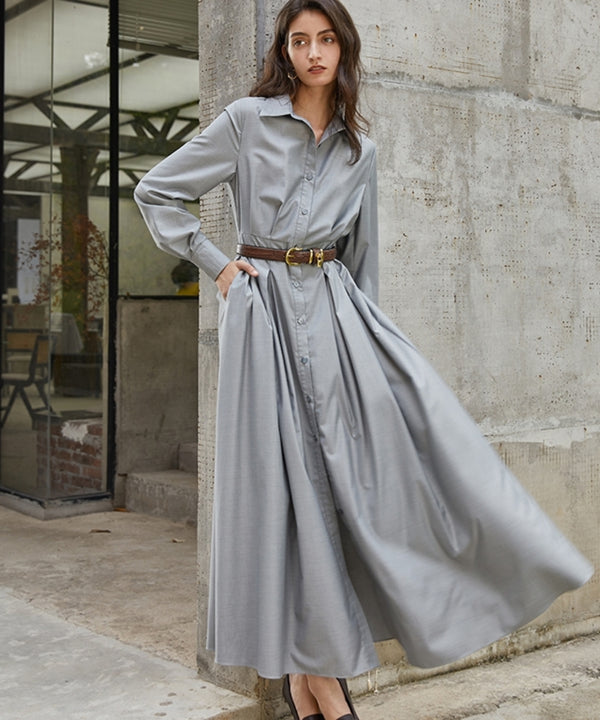 タックやプリーツが縦ラインを強調するシャツワンピースは、ぽっちゃりさんでもスッキリ見える優秀アイテム。ふんわりシルエットにベルトでウエストマークすれば、メリハリが生まれスタイルアップ。上品なグレーでさらに細見え効果もばっちり。