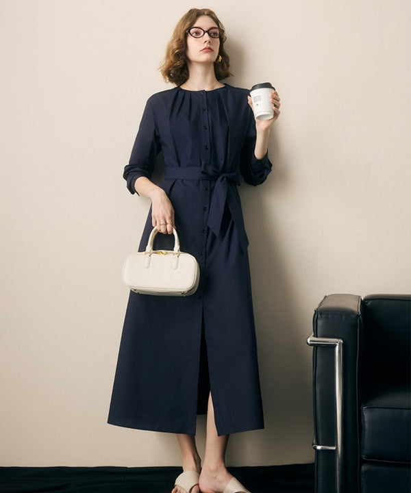 ウエストリボンが自然にくびれをつくるネイビーのロングシャツワンピースは、ぽっちゃりさんに嬉しい細見え効果抜群。ノーカラーの襟なしデザインが首元をすっきり見せ、上品で大人っぽい印象に。一枚でバランス良く着こなせる優秀アイテムです。