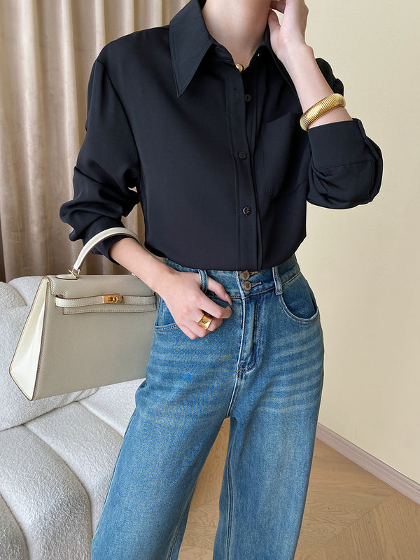 シンプルなドレープシャツは、落ち感のある素材がきちんと感を演出し、オフィスにも馴染む上品な一枚。デニムパンツを合わせれば、ほどよくカジュアルダウンして大人の余裕を感じるスタイルに。黒の持つ洗練さで、シンプルでも魅力的なコーデが完成します。