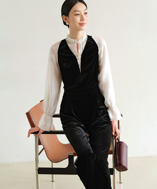 ベルベットとシフォンのエレガントな組み合わせが素敵なジャンプスーツ。