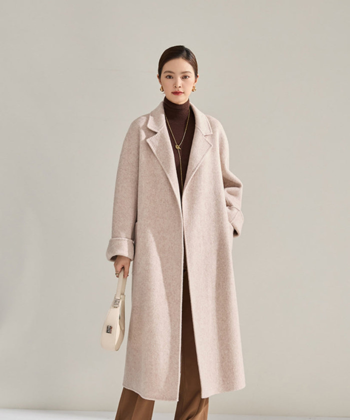 淡色コーデを簡単に垢抜けさせるコツは、微配色のグラデーションを意識すること。トーンが近い色を重ねるだけで上品にまとまります。さらにコートは襟付きデザインを選ぶと、顔まわりがすっきり見え、大人らしい清潔感も加わります。