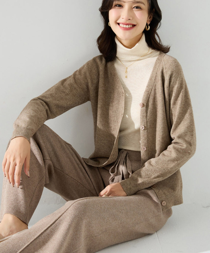 上下の色を揃えるだけで、簡単にセットアップ風の統一感が手に入ります。カーディガンとボトムスを同色でサンドイッチすれば、インナーの白が差し色として引き立ち、技ありな配色に。リラックス感のある休日コーデにもぴったりです。
