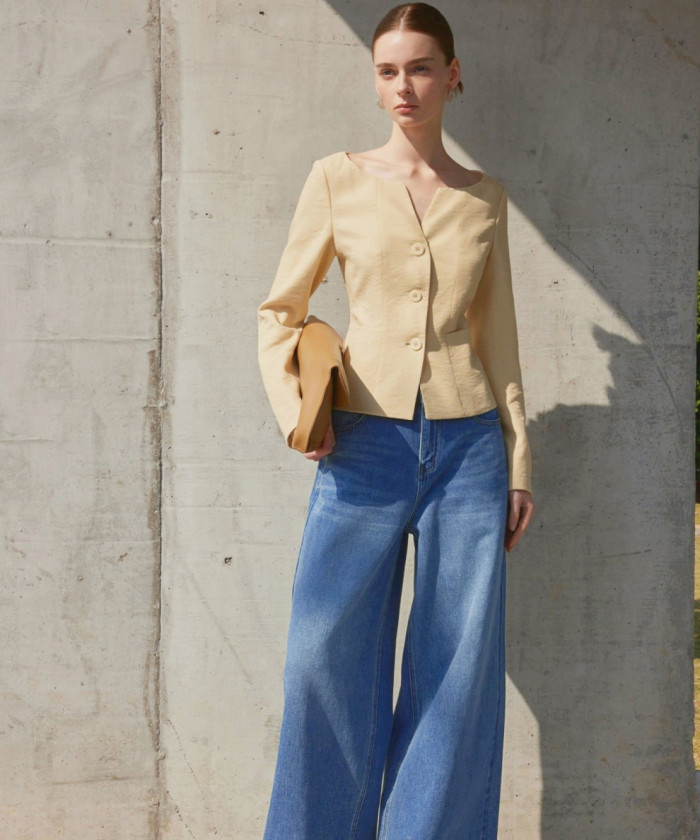 首元がカットされているこちらのジャケット。首周りをスッキリ見せ、上品な印象を与えてくれます。ボトムにワイドデニムを合わせれば、ジェケットとのギャップでピリッと辛口コーデに。