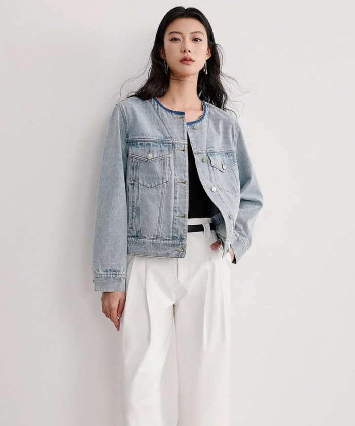 シンプルなモノトーンコーデにデニムジャケットを投入すれば、垢抜けた大人のカジュアルコーデに。ノーカラーのデニムジャケットは女性らしさとかっこよさを同時に引き出します。白のボトムスとデニムジャケットが、爽やかで上品な大人女子を作ります。