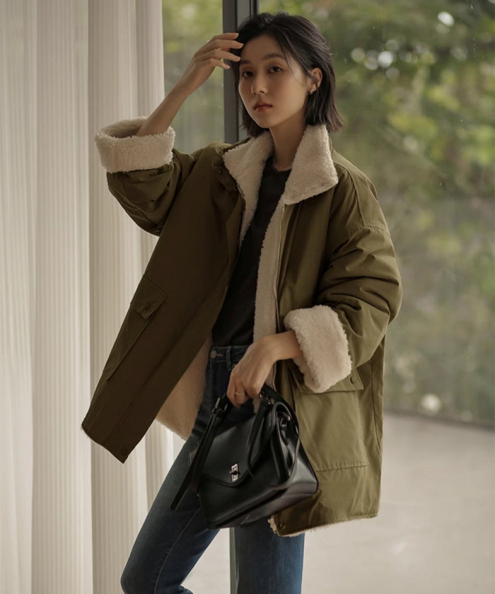 ボアの暖かさがありながら、過度に膨らまないミリタリーデザインが特徴のジャケット。程よい丈感で腰まわりをカバーしつつ、縦のラインを残してくれるので、スウェットやニットを重ねてももたつきません。朝晩の送り迎えでもさっと羽織れて、カジュアルながらきれいめ見えも叶う一枚です。