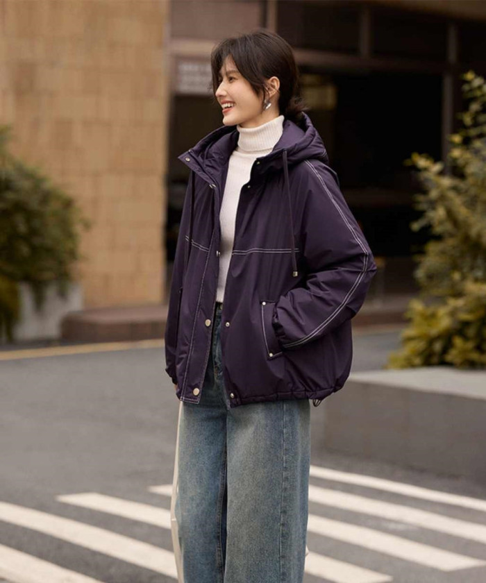 パープルが程よく華やぐフード付きマウンテンジャケット