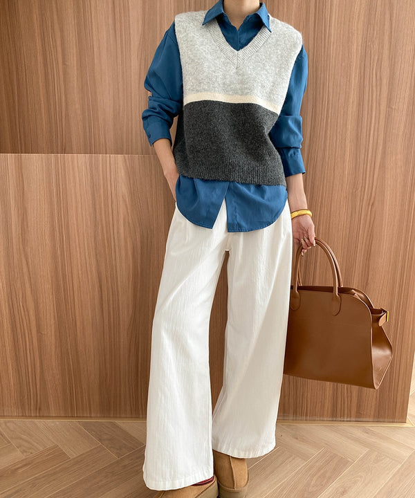 ベスト+シャツを合わせた王道プレッピースタイル。ボトムスはブルーデニムやチノパンでも合いそうですが、上品に魅せるにはホワイトパンツがおすすめ。バイカラー仕様のベストでちょっぴり個性も足して、学生さんとはまた違った大人女子ならではの余裕を感じさせたい。