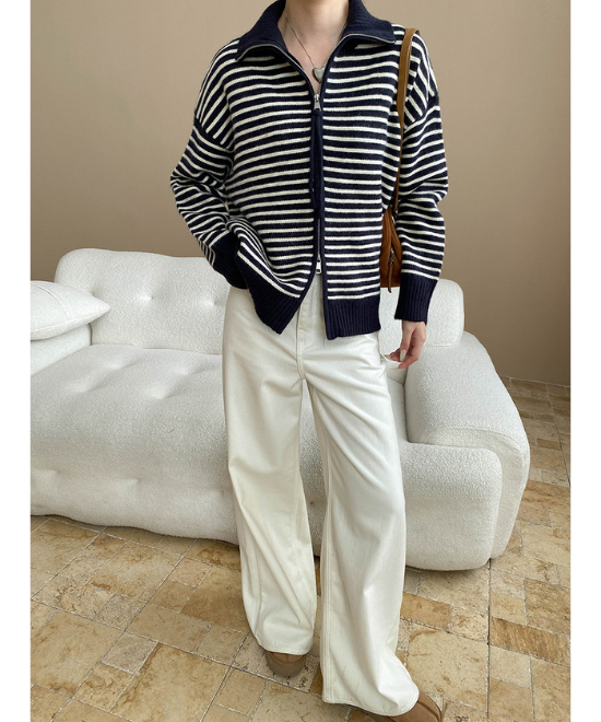 カジュアルやスポーティー、そんなイメージもあるボーダー柄ですが、ホワイトのパンツを合わせた冬のマリンコーデもおすすめ。アイテム自体はカジュアルでも、美しく調和の取れたスタイルが程よくきちんと見せてくれますよ。ジッパー付きでライトアウターにも。